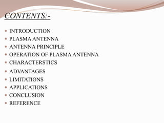 The document discusses plasma antennas, which use ionized gas instead of metal conductors. Plasma antennas have advantages over traditional antennas like higher efficiency and enhanced bandwidth. They operate by ionizing a gas to create plasma that can radiate or receive radio waves. However, plasma antennas also have limitations like higher costs and not being suitable for mobile use. The document reviews the basic principles, operation, characteristics, advantages, limitations and applications of plasma antennas.
