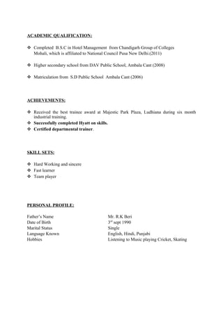 Shivam Beri is seeking a challenging position that values hard work and teamwork. He has over 7 years of experience in hospitality, including roles as team leader at Hyatt Regency Chandigarh and Hyatt Regency Gurgaon. He has a Bachelor's degree in Hotel Management from Chandigarh Group of Colleges. His skills include being a hard worker, fast learner, and team player.