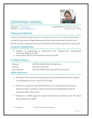 Shivangi Sinha is seeking a position that allows her to utilize her skills and experience in environmental regulatory compliance to help achieve organizational goals. She has over 8 years of experience in the automotive and chemical industries, specializing in product stewardship, REACH and ELV compliance using tools like IMDS, CAMDS, and SAP EHS. Her experience includes creating material data sheets, ensuring regulatory compliance, managing hazardous substance restrictions, and providing training and presentations on environmental regulations. She is proficient in various compliance software and tools, and aims to continue developing her leadership, communication, and project management skills.