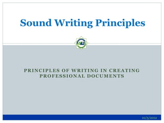 The document outlines principles for effective professional writing. It discusses two main objectives: to inform readers by communicating information efficiently, and to persuade readers through logical arguments. It emphasizes being precise, clear, forthright, familiar, and concise with language usage. Specific guidelines are provided, such as choosing accurate wording, avoiding ambiguity, and making writing fluid through sentence variety. The overall message is that professional writing should aim to clearly yet engagingly communicate essential information to readers.