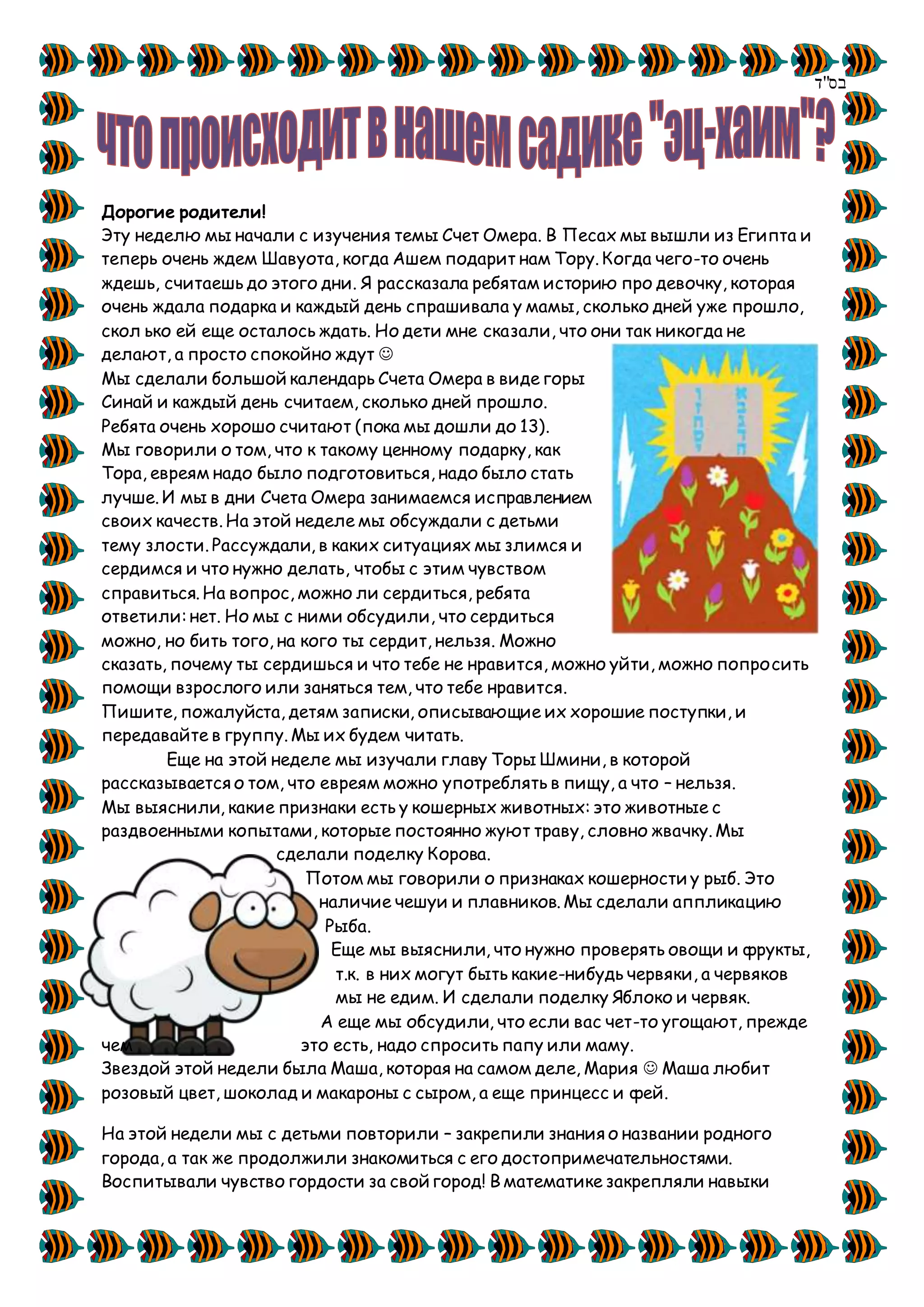 На этой неделе дети изучали счет омера, готовясь к Шавуоту, а также обсуждали тему злости и способы с ней справляться. Уроки включали изучение кошерных правил питания и творчество, такое как поделки, связанные с темами уроков. В рамках развития речи и математики дети закрепляли знания о своем городе и играли в игровые упражнения.
