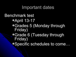 This document provides information and instructions for administering benchmark tests to 5th and 6th grade students at Spring Hill Middle School in Bentonville. It outlines important dates for the testing, training requirements, test materials, accommodations, security procedures, and responsibilities of proctors, teachers and administrators.