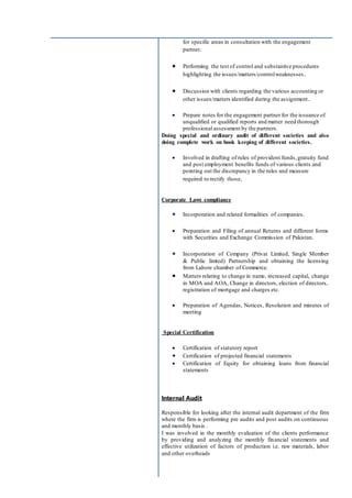 This document provides a summary of an individual's career objective, professional qualifications, academic qualifications, professional experience, and personal details. The individual's objective is to contribute to the growth of an organization with opportunities for personal and professional growth. Their professional experience includes over 3 years of experience as an Assistant Audit Manager at a chartered accountancy firm, where they have gained experience in audit, accounts, taxation, and compliance work for various organizations. Their professional qualifications include an ACMA and they are pursuing further qualifications.