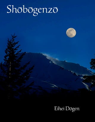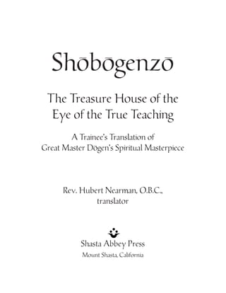 This document provides context and acknowledgments for a translation of the Shobogenzo, a spiritual masterpiece by Japanese Zen master Dogen composed of 95 discourses given to his disciples between 1231-1253. The translator undertook the massive project at the request of his master, Rev. Jiyu-Kennett, to whom he is deeply grateful. He also thanks others who provided support and editing assistance over the 14 years it took to complete. The translation is offered freely in memory of Rev. Jiyu-Kennett to benefit all beings.
