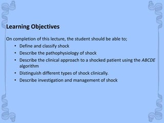 This document defines and classifies shock, discusses the pathophysiology of different types of shock, and outlines the clinical approach and management of shocked patients. Shock is classified into four main types: hypovolemic, cardiogenic, obstructive, and distributive. For each type of shock, the causes, mechanisms, clinical findings, specific investigations, and treatments are described. The document emphasizes the importance of the ABCDE (airway, breathing, circulation, disability, exposure) algorithm in the emergency clinical approach to shocked patients.