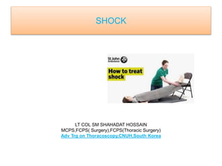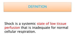 Shock is defined as inadequate tissue perfusion and oxygenation. There are five main types of shock: hypovolemic, cardiogenic, obstructive, distributive, and endocrine. Shock causes a decrease in cardiac output, vasoconstriction, and activation of stress responses in an attempt to maintain perfusion to vital organs. If shock persists, cellular damage occurs due to hypoxia, acidosis, and organ dysfunction. Treatment focuses on restoring circulating volume and oxygen delivery through fluid resuscitation, vasopressors, and inotropes while addressing the underlying cause. Septic shock involves an inflammatory response to infection that can lead to multiple organ dysfunction syndrome if not promptly treated with antibiotics and circulatory