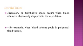 Circulatory shock occurs when blood volume is displaced in the vasculature, causing hypovolemia and decreased cardiac output. There are three main types: septic shock (caused by infection), neurogenic shock (caused by loss of sympathetic tone), and anaphylactic shock (caused by allergic reaction). Septic shock is the most common and results from an immune response to infection that causes widespread vasodilation and capillary leakage. Treatment involves identifying and treating the infection, restoring intravascular volume, and providing supportive care.