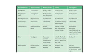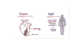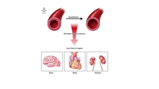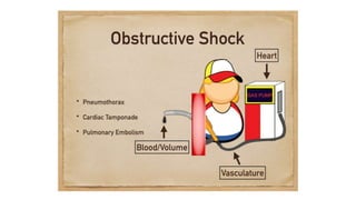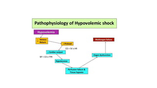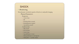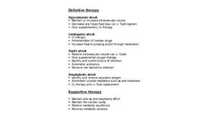 3. Treatment for shock involves rapid fluid resuscitation to restore circulating volume, with vasopressors or inotropes as needed depending on the type of shock. Ongoing monitoring of vital signs and urine output is also critical.