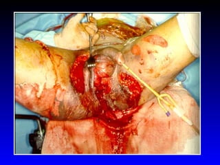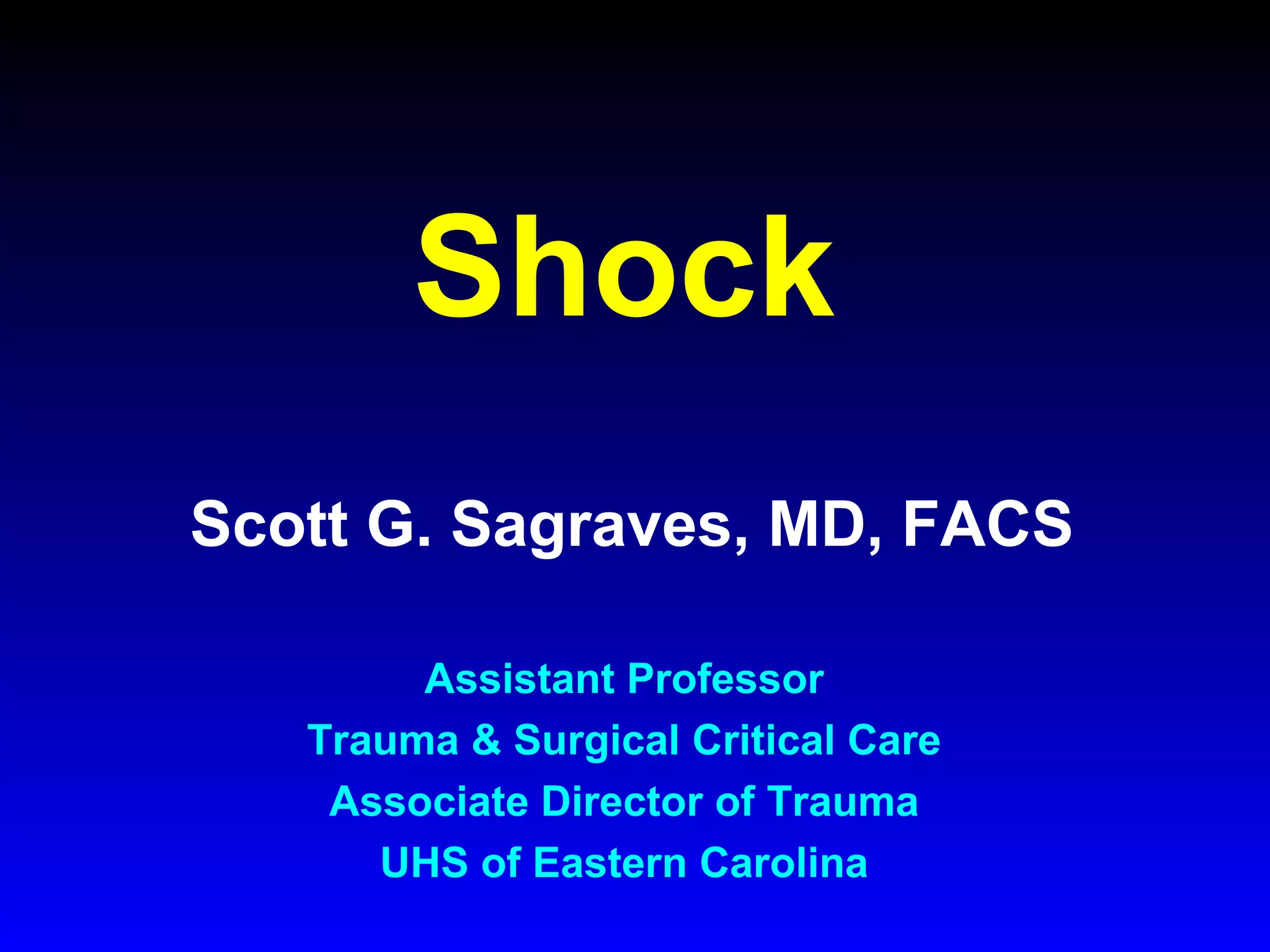 This document provides an overview of shock and hemodynamic monitoring using a pulmonary artery catheter. It defines shock as inadequate organ perfusion and outlines the main categories of shock: hypovolemic, cardiogenic, distributive, and obstructive. It discusses goals of fluid resuscitation in shock and reviews hemodynamic parameters measured by a pulmonary artery catheter such as cardiac output, vascular resistances, and oxygen transport variables. The document uses case studies to demonstrate how these parameters can be utilized to diagnose and guide treatment in different shock states.