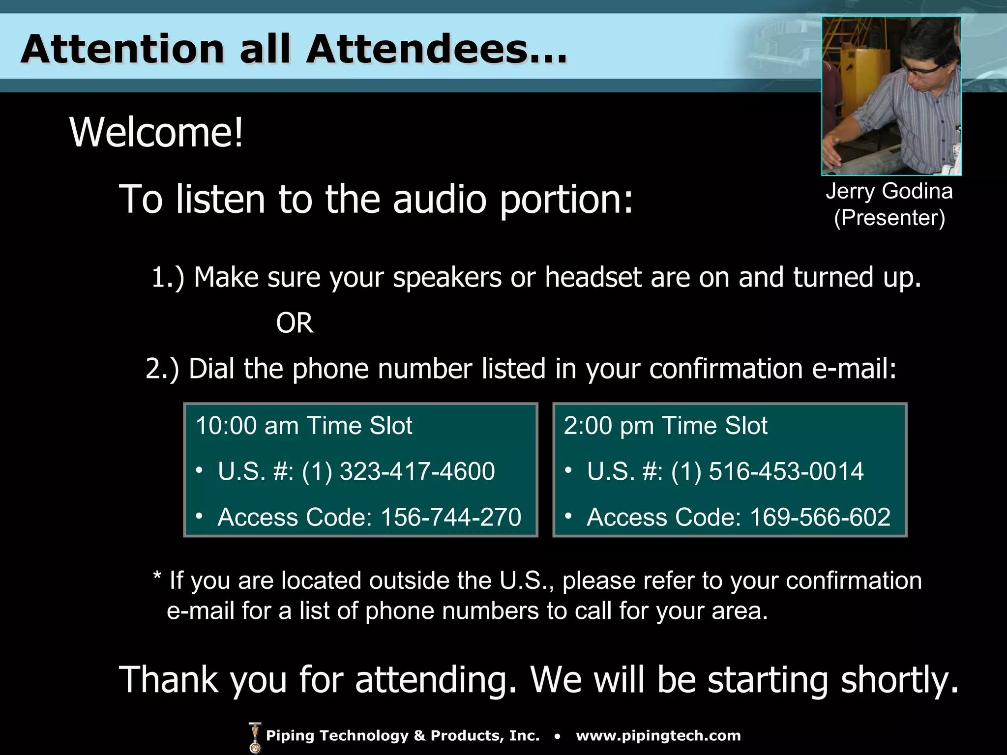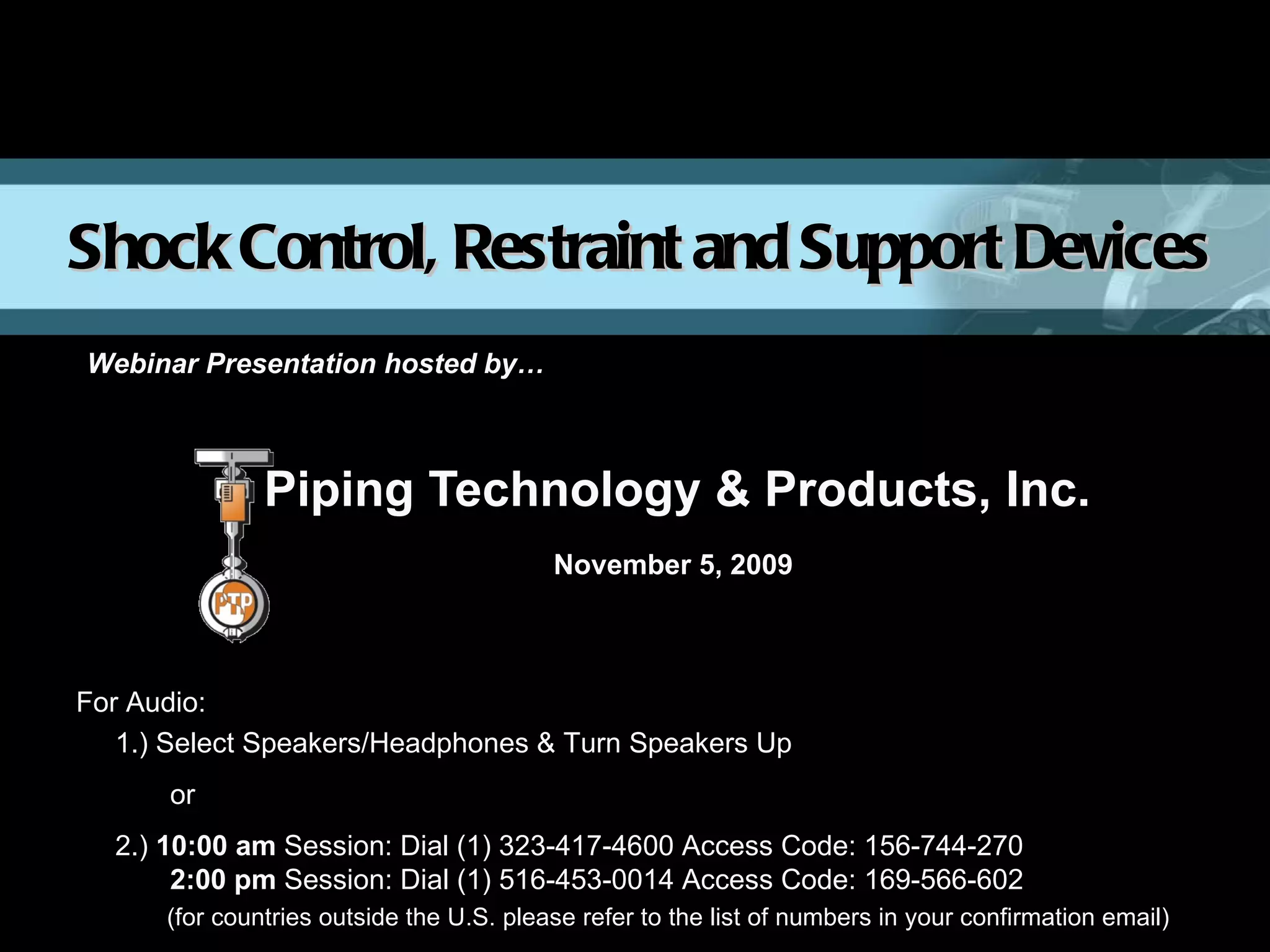 The document provides details about a webinar hosted by Jerry Godina on shock control, restraint, and support devices, specifically discussing various types of snubbers, sway braces, and sway struts. It includes audio instructions for attendees and technical specifications for the equipment discussed. Additionally, it outlines the manufacturing certifications and capabilities of Piping Technology & Products, Inc.