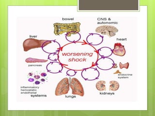 The document provides a detailed overview of shock, including its definition, pathophysiology, various etiologies, clinical features, and management strategies. It categorizes shock into types such as hypovolemic, cardiogenic, obstructive, neurogenic, anaphylactic, and septic shock, along with their respective causes and symptoms. Management emphasizes monitoring, treatment goals to improve oxygen delivery, fluid therapy, use of vasopressors, and the importance of early recognition and intervention.