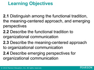 This document outlines different perspectives on organizational communication: the functional tradition, meaning-centered approach, and emerging perspectives. The functional tradition views communication as achieving organizational goals. The meaning-centered approach sees communication as constituting organizations through processes like socialization and culture. Emerging perspectives examine how communication constitutes organizations and is shaped by factors like technology, globalization, and power structures related to gender, race, and class.