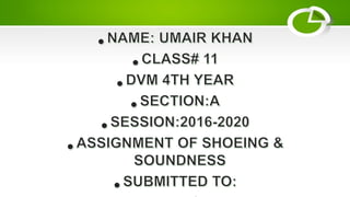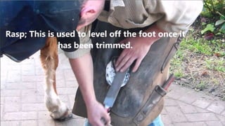 The document discusses the reasons why horses need to be shod and the shoeing process. It states that while shoeing has benefits like protecting the hoof from wear and providing traction, it is ultimately a necessary evil since it increases shock and weight. The document outlines how domestication led to foot problems in horses by changing their environment and diet. It then discusses how farriers should properly shoe horses, including fitting the shoe to the foot and reshoeing every 4-6 weeks. Common hoof issues like splayfoot and contracted heels are also described.
