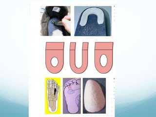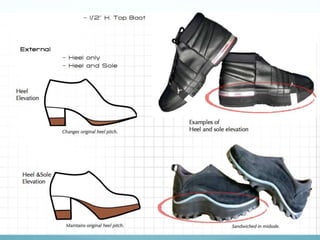 The document discusses shoes and orthopaedics. It provides details on the normal anatomy of a shoe, including the upper, sole, heel, linings and reinforcements. It describes different shoe styles and discusses surgical footwear. The document outlines how to check if a shoe fits correctly and discusses various modifications that can be made to existing footwear to relieve pain, such as heel pads, metatarsal bars, and rocker bars. It also covers compensating for leg length discrepancies using heel raises.