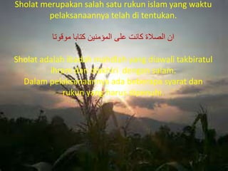 Sholat adalah rukun Islam yang merupakan tiang agama dan wajib dilaksanakan dalam berbagai keadaan. Ibadah sholat mencegah perbuatan keji dan mungkar, serta syarat dan rukunnya harus dipenuhi. Menegakkan sholat berarti menegakkan agama, sedangkan meninggalkannya dapat menghancurkan agama.