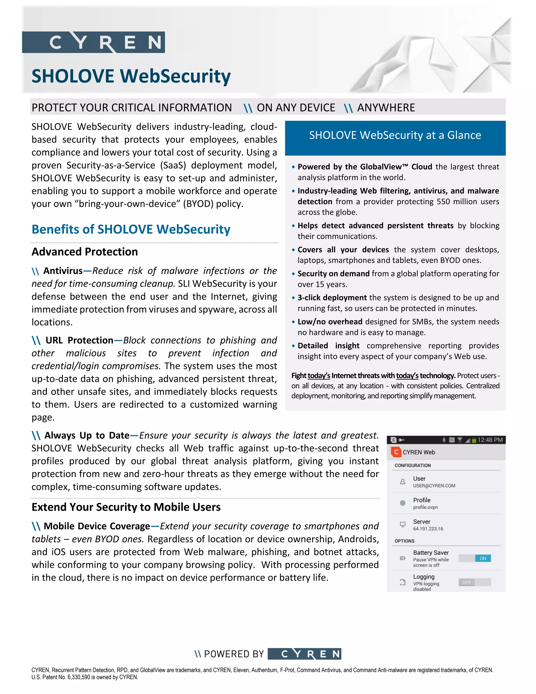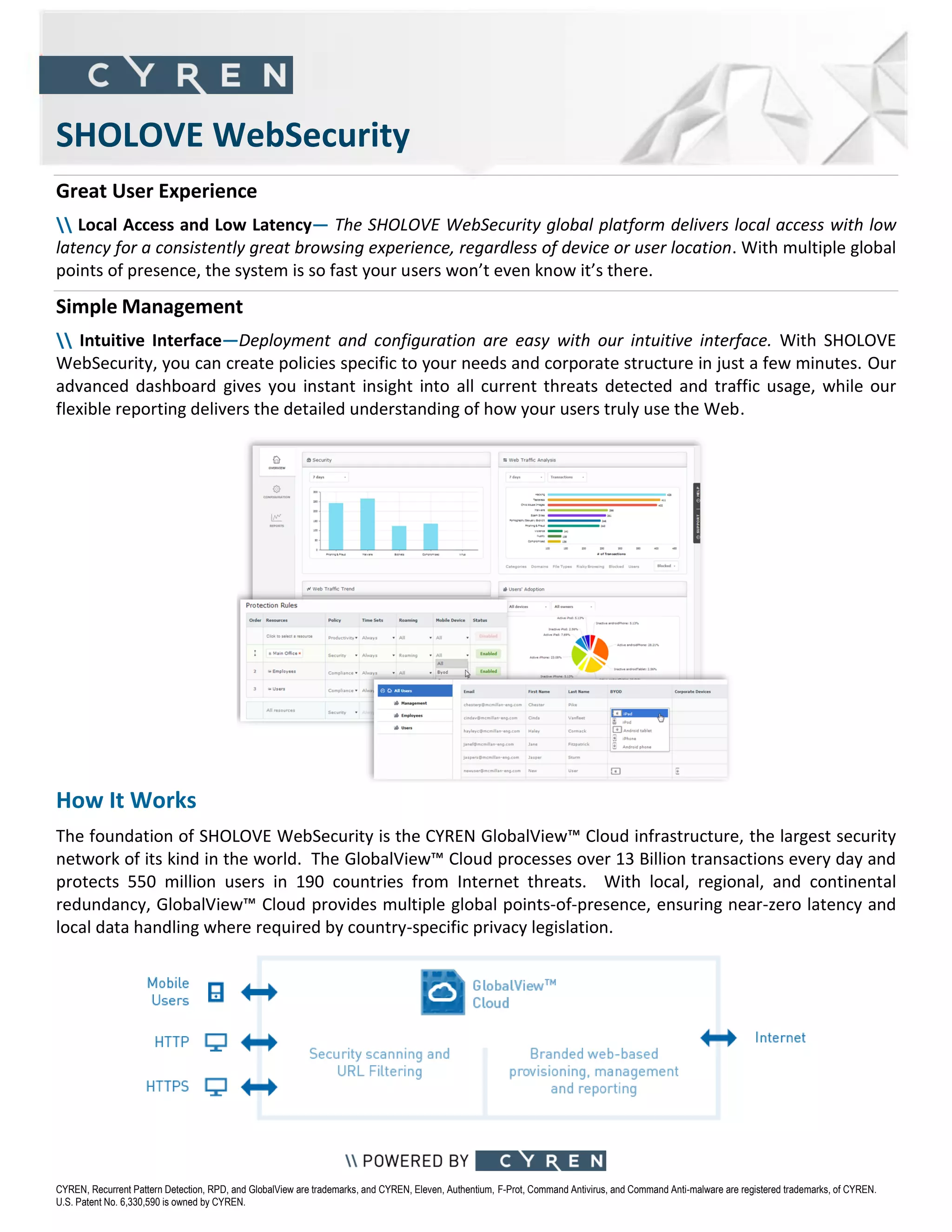 SHOLOVE WebSecurity is a cloud-based security solution that protects employees and enables compliance from threats across devices and locations. It uses the CYREN GlobalView Cloud infrastructure and its analysis of over 13 billion daily transactions to provide advanced protection from malware, phishing, and botnets. The solution offers mobile coverage, low latency experience, and simple management through an intuitive interface.