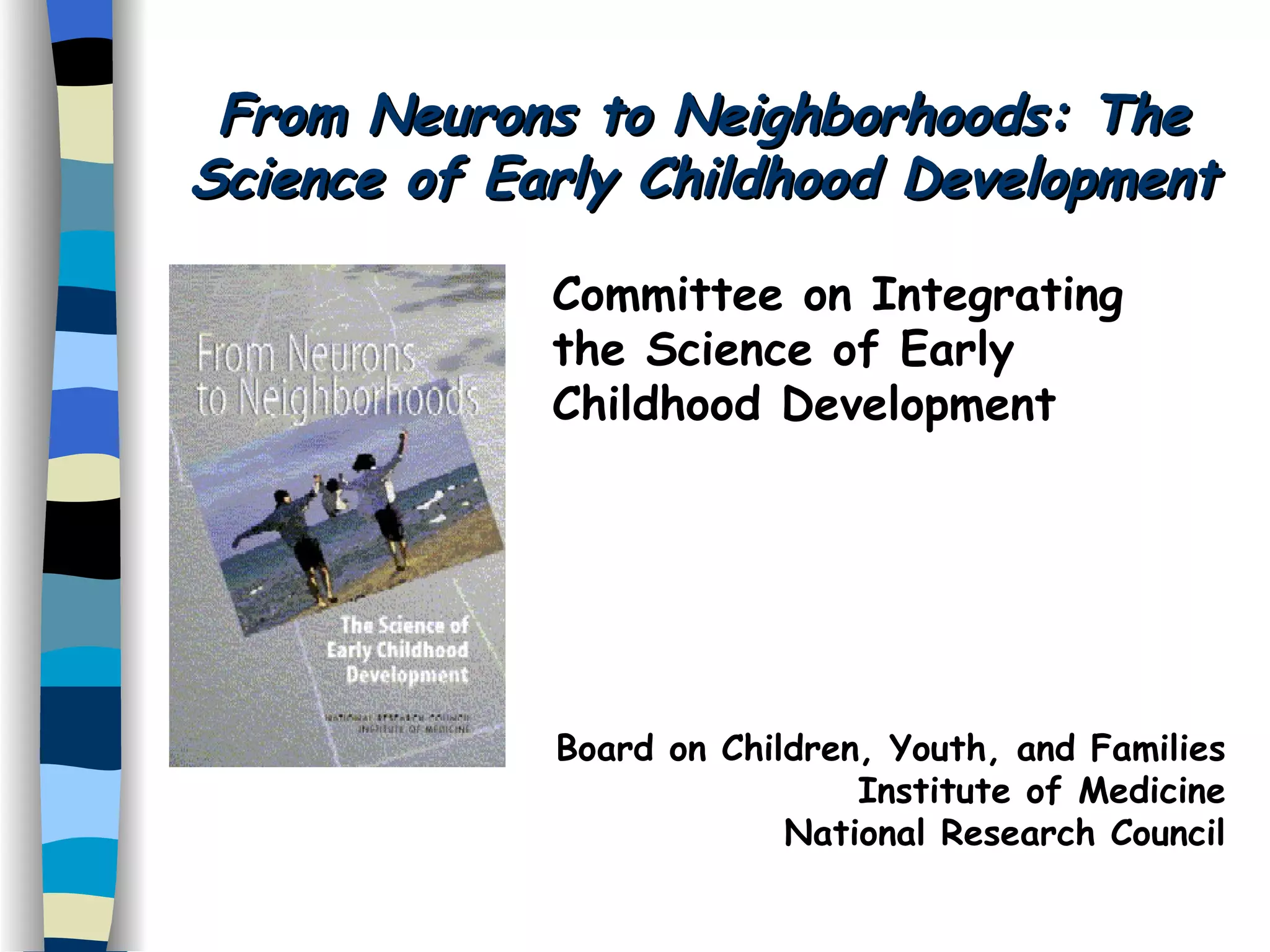 This document summarizes the findings of the Committee on Integrating the Science of Early Childhood Development. The committee concluded that early experiences influence brain development and that nurturing relationships are important for healthy development. However, early intervention programs that work are rarely simple or inexpensive. The committee made recommendations for policy and practice, including giving greater attention to social-emotional development, recognizing the importance of early childhood educators, enhancing support for working families, and reducing fragmentation of policies and services to better support early childhood development.