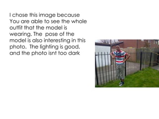 This document discusses five photos selected from a photo shoot. For each photo, the author explains why they chose it. They highlight aspects like the model's pose, visibility of the outfit, lighting, background elements, and how well each photo fits the theme of showing off the outfit or capturing a child at play.