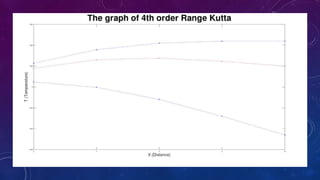 The document outlines a mini project for numerical methods involving the modeling of a heated rod using the Poisson equation and the comparison of temperature distribution solutions obtained from second and fourth order Runge-Kutta methods. It includes a detailed explanation of the shooting method used to solve boundary value problems, along with corresponding data for the iterative solutions and the final outputs for each method. The project showcases graphs comparing the numerical solutions derived from both methods, highlighting the findings and contributions of the group members.