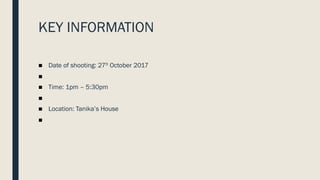 The shooting plan outlines filming a domestic abuse scene on October 27th from 1-5:30pm at Tanika's house. The director, cinematographer, actor, Canon 700D camera, batteries, tripod, shoulder rig, and SD cards are listed. It describes discussing the scene with an advisor, applying makeup, getting actor lines correct, and capturing different shots and angles to evoke strong emotions. After filming, some shots were blurry from switching lenses but it was a learning experience and they got good footage to improve next time.