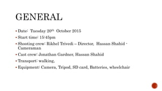 A film crew will shoot scenes on October 20th involving an actor portraying a patient named Daniel at a health clinic. They must pick up camera equipment, a doctor's coat, medicine bottles, and get permission to film at the clinic. The health clinic scenes aim to convey Daniel's frustration with his disability through a conversation with his doctor, Daniel throwing his medicine, and the doctor pushing Daniel's wheelchair outside.
