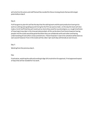 Day 4 continues similar to Day 3, aiming to get all needed shots to arrange footage for the next day. An email