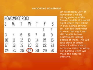 2) On November 27th, photos of female models will be taken at a school social night, where the photographer can instruct them on outfits and use the white backdrop and lighting equipment available at the school.