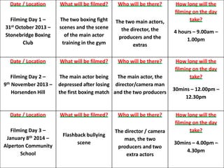 The document outlines the filming schedule for three days of a boxing film. On October 31st, boxing fight scenes and gym training will be filmed at Stonebridge Boxing Club from 9am to 1pm. On November 9th, a scene of the main actor being depressed after a loss will be shot at Horsenden Hill from 12pm to 12:30pm. Finally, on January 8th, a flashback bullying scene will be filmed at Alperton Community School from 4pm to 4:30pm.