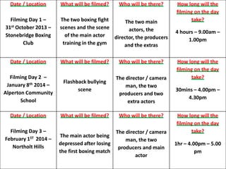 The document outlines the filming schedule for three days of a boxing film, including the locations, scenes being filmed, attendees, and estimated filming times for each day. On the first day at a boxing club, fight scenes and training footage will be shot over 4 hours with actors, directors and extras. A second day at a school will film a 30-minute bullying flashback scene. The third day in a park will film the main actor depressed after a loss for 1 hour.