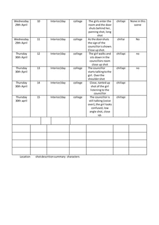 This document outlines a shooting schedule for a film with 15 scenes to be shot over 5 days. The scenes will take place both interiors and exteriors at locations like a house and college. They involve a character named Chillapi and include shots like extreme close-ups, panning shots, and over-the-shoulder shots. Many scenes involve Chillapi in a counselling session, getting ready with makeup, or walking around the college. Props include makeup, mirrors, and signs indicating the counselor's office.