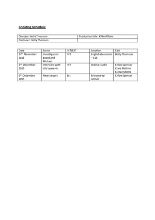 The shooting schedule outlines 3 scenes to be filmed between November 17th and December 9th 2015 for the production "Killer Affairs". The first scene on November 17th will film Michael in an English classroom investigating a board. The second scene on December 2nd will interview Lily's parents in a drama studio. The final scene on December 9th will film a news report outside a school entrance.
