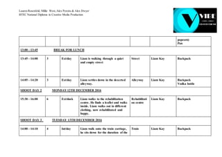 This shooting schedule outlines 3 days of filming for a student film project. Day 1 will include scenes at a cemetery, inside a house showing a character taking drugs and getting kicked out, and character walking through empty streets. Day 2 includes a scene at a rehabilitation center. Day 3 includes scenes on a train, on Waterloo Bridge with a character considering jumping off and being talked down, and reshoots of previous scenes inside a house. The schedule provides details on locations, characters, and any equipment needed for each scene.