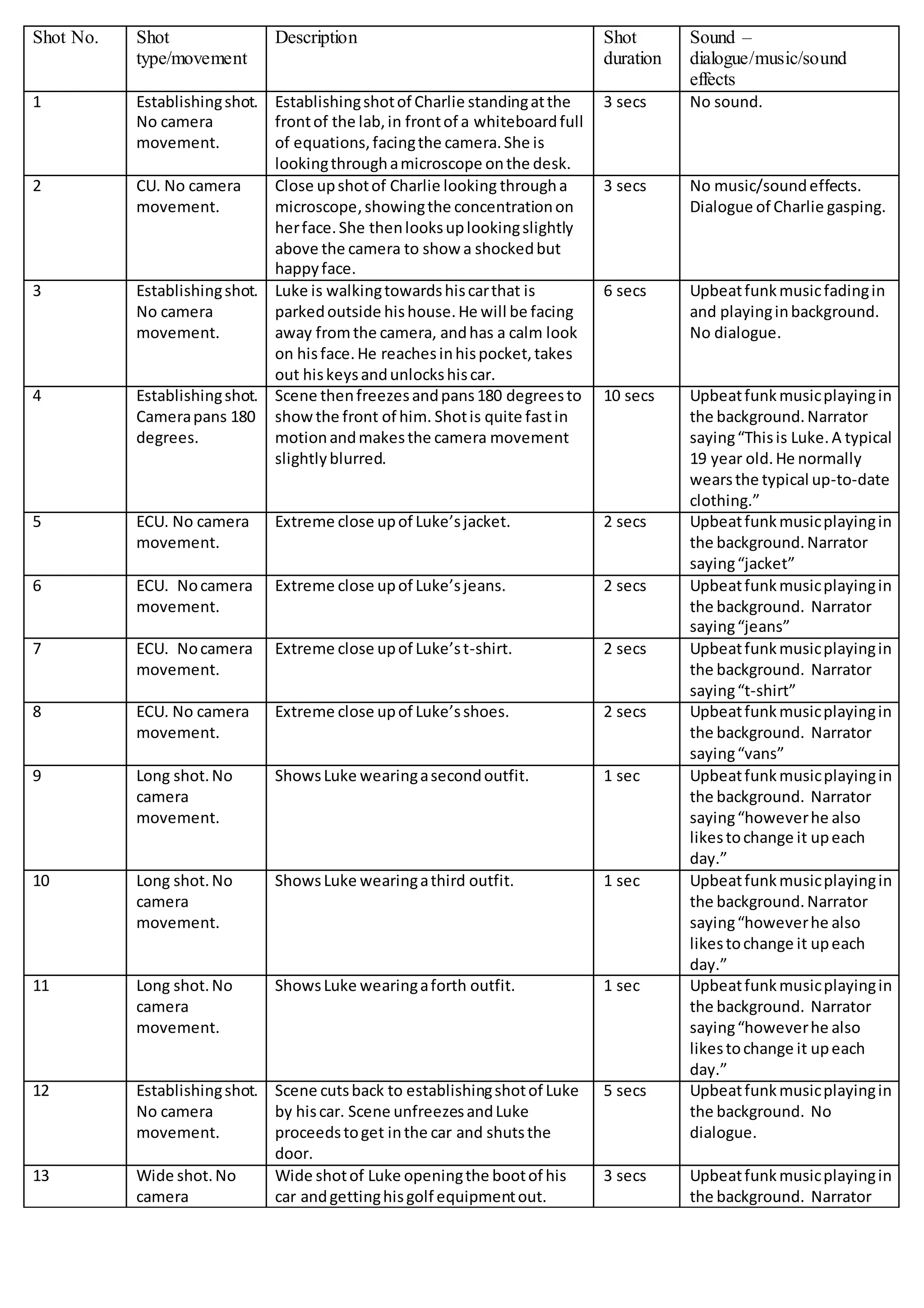 The document describes scenes from the lives of three teenagers - Luke, Mia, and Charlie - through a series of shots with descriptions. Luke is shown getting ready in the morning, playing golf, and recording music. Mia watches the ocean daily and wonders what it's like to be "normal" while dealing with OCD. Charlie arrives at a lab and freezes a scene to describe her typical attire of t-shirt and jeans. The shots establish routines and personality traits for each character through their appearances and activities.