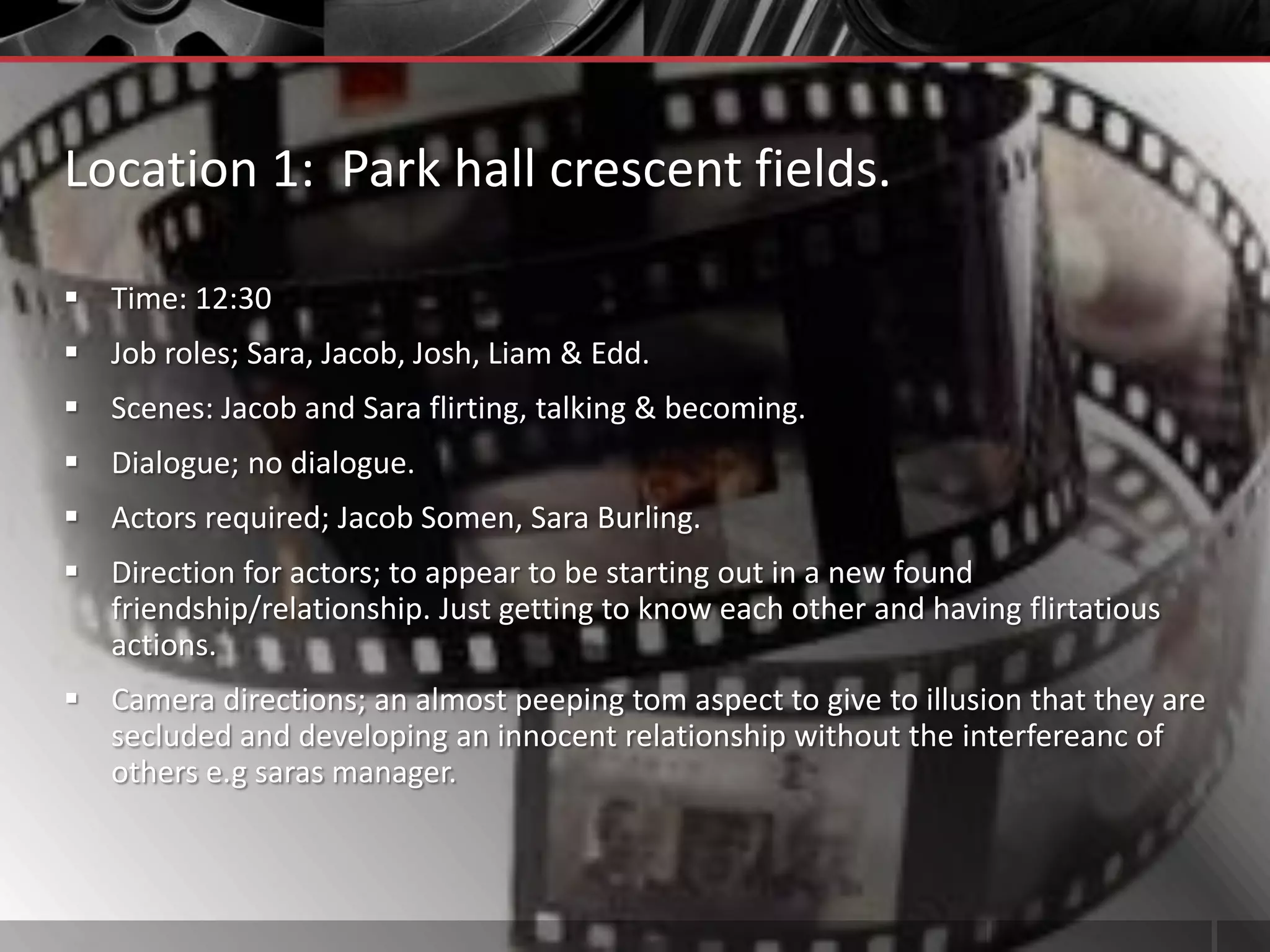This shooting script outlines 4 locations and scenes for a film shoot. The first two locations involve Jacob and Sara flirting in a park and Jacob's house, with directions for the actors to appear as though a new friendship is developing. The third location has Jacob being threatened by Seb after leaving the gym. The fourth and final location shows Sara meeting a potential client in a car park, with directions to create awkwardness. Various camera shots are listed including over the shoulder, close up, tracking and establishing shots.