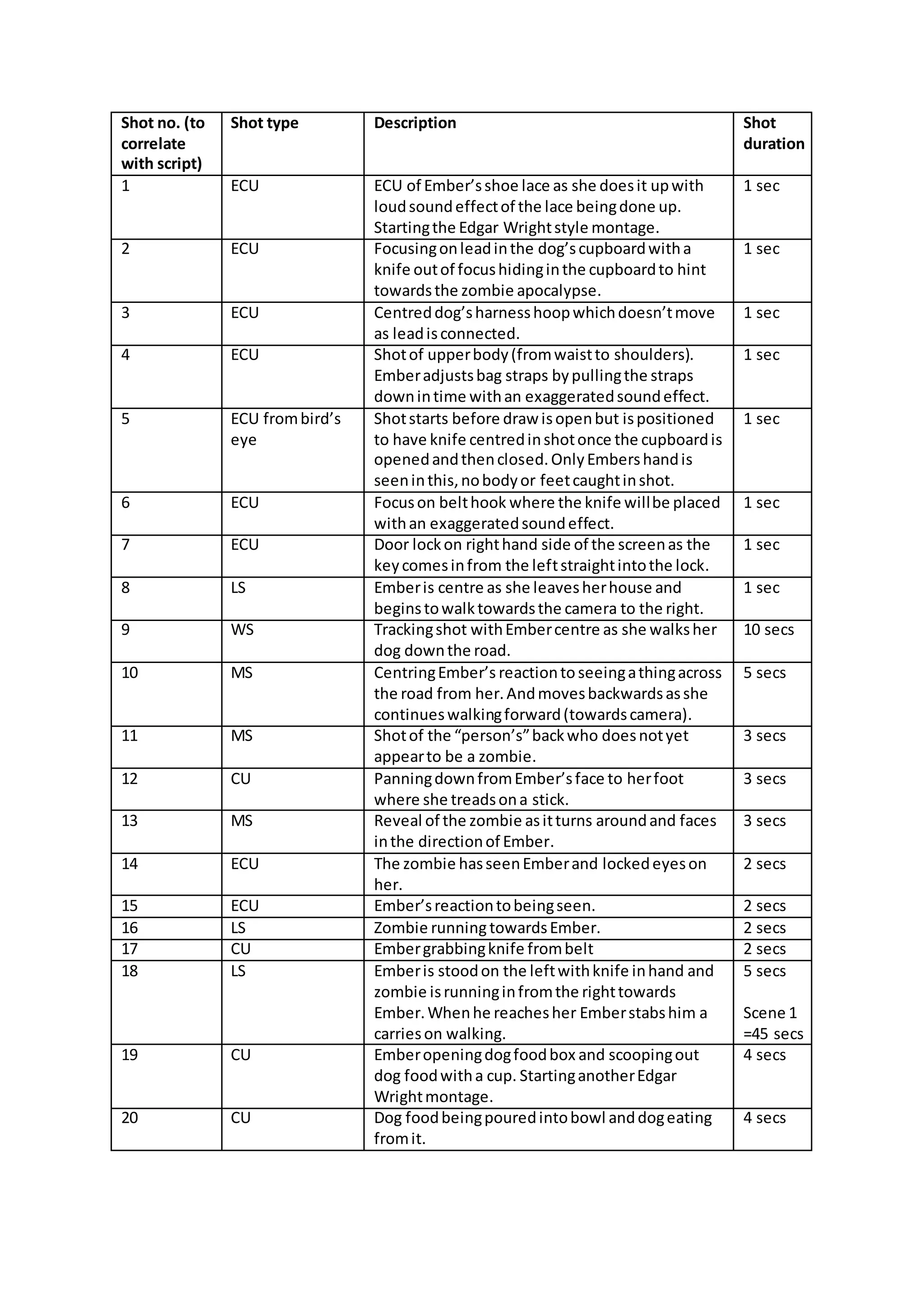 The document provides a shot list for a film scene depicting interactions between two characters, Ember and Riley. It contains 95 shots ranging from 1 second to 15 seconds in length. The shots progress from Ember preparing for the day and encountering a zombie, to Riley arriving at Ember's house with an offering of beans. The characters share a meal and have a long conversation consisting of many close-up shots focusing on each as they speak. They discuss their situations in the zombie apocalypse. In the final shots, Riley and Ember prepare to leave together.