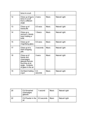 This shooting script outlines 20 shots of varying lengths that will be filmed using natural lighting. The shots include establishing shots of a skyline and gravestones, close-ups of trains, pill bottles, a diamond ring, a family portrait, a torso in a suit, handcuffs, a bloody hand holding a knife, a magnifying glass, hands dropping pills and holding champagne glasses, a gun, and smashed champagne glasses. Precise timing and natural lighting are required to capture the shots as intended before sunset.