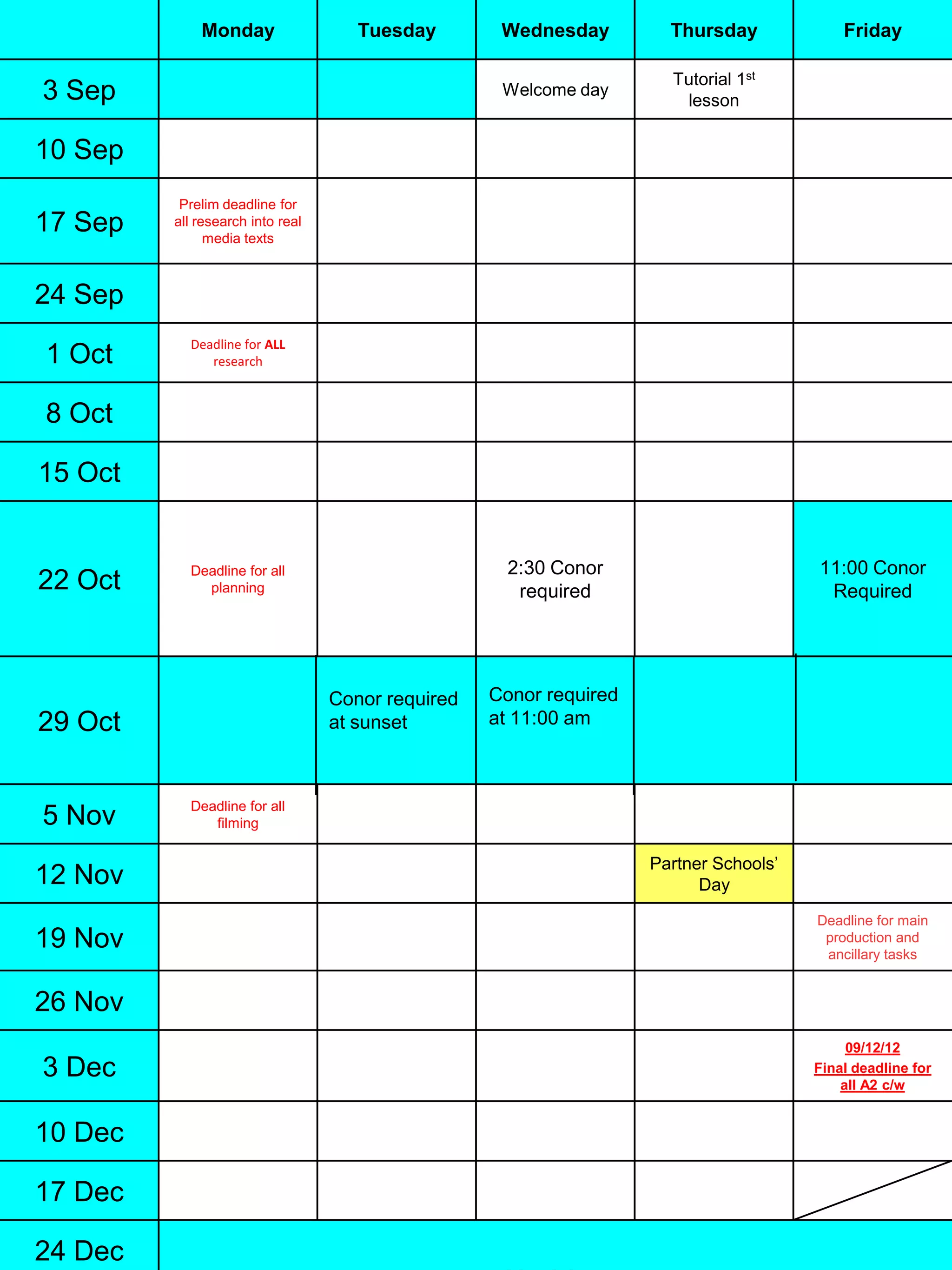 The document contains a schedule for an academic course, listing important deadlines throughout September to December. Key deadlines include prelim research by September 10th, all research completed by September 24th, planning finished by October 22nd, filming wrapped by November 5th, and the final deadline for all coursework on December 3rd. Tutorials, required meetings with Conor, and a Partner Schools' Day are also scheduled throughout the term.