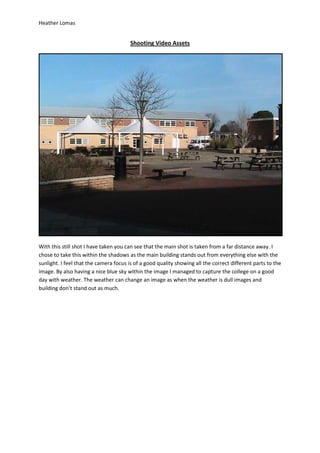 1) The document discusses still shots and video assets taken at Cheadle Campus college.