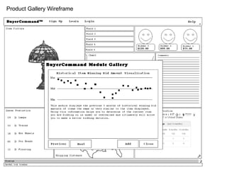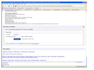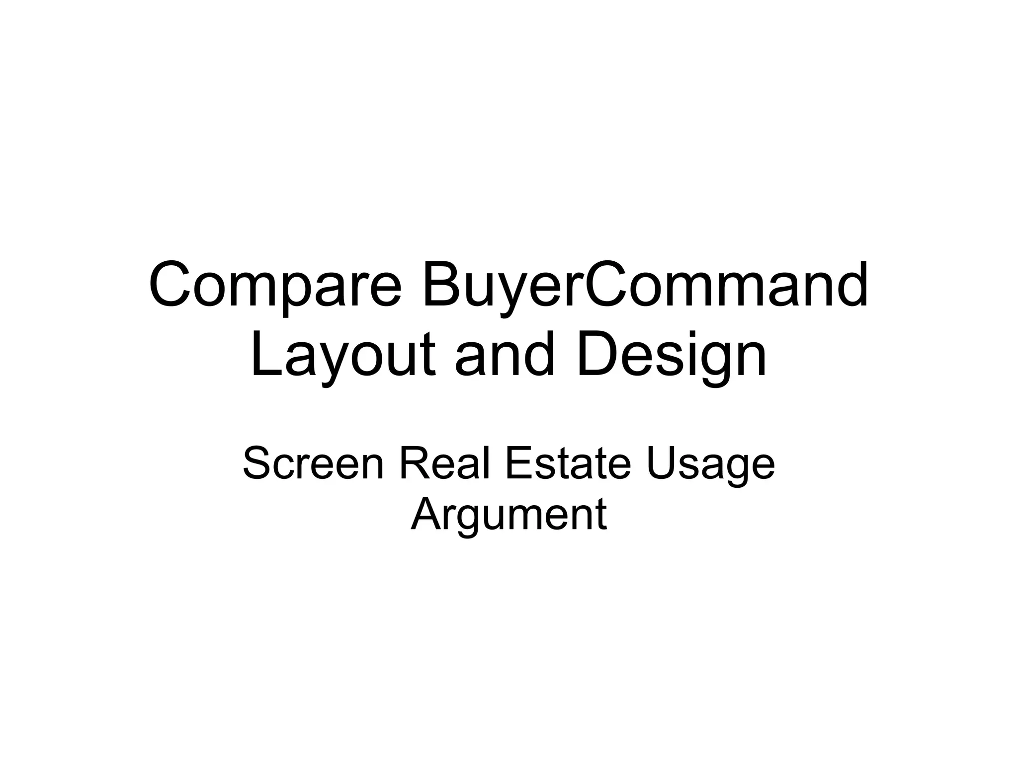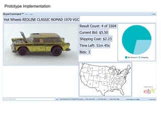The document discusses optimizing eBay's interface for users, highlighting that a significant portion of the screen space is wasted on ads and navigation rather than item details. It presents metrics on screen utilization and suggests that only a small fraction of the screen is dedicated to valuable item information, indicating a need for better layout customization and larger images. Recommendations include enhancing pictures and providing a more organized, user-friendly browsing experience through a tool called BuyerCommand.
