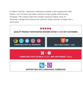 Shopfine is a versatile and responsive VirtueMart template designed for various types of online stores. It offers numerous features, including a mega menu, one-page checkout, color swatch integration, and responsive design that adapts to all devices. The template also includes options for wishlist, comparison, and a customizable font, enhancing the overall shopping experience for customers.