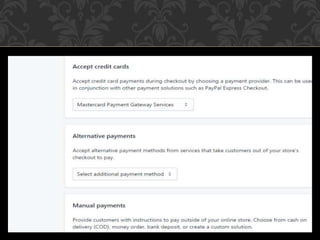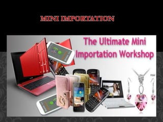 This document provides information on starting a mini importation business. It discusses what mini importation is, the capital needed to start which can be as little as 20,000 Naira, researching goods to import, promotion strategies, sales processes, trusted online marketplaces to source goods, how to set up an online store using Shopify, adding products, customizing the store, and contact information for getting started.