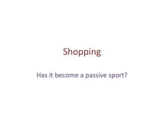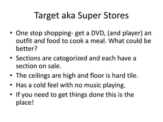 The document discusses different shopping experiences at various stores. It contrasts the impersonal atmosphere at big box stores like Target with the more welcoming environments at smaller stores like Petsmart, Hallmark, and Mardel. While large stores can be efficient for one-stop shopping, they tend to feel cold and overwhelming due to lack of music, human contact, and high ceilings. In contrast, smaller stores that greet customers by name and engage with both people and their pets create a warmer atmosphere where customers want to linger and return.