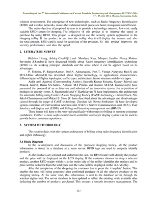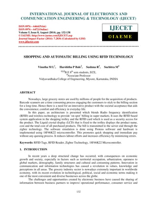 This document summarizes a research paper on an automatic shopping and billing system using RFID technology. The system uses RFID tags on products and RFID readers in a shopping cart to automatically identify items placed in the cart. It displays the item names, prices and total on an LCD screen on the cart. When shopping is complete, the total bill information is transmitted wirelessly to a server using Zigbee technology. This allows for quick and easy shopping without queues for billing. The system aims to improve shopping efficiency and reduce errors by automating the billing process using RFID and wireless technologies.