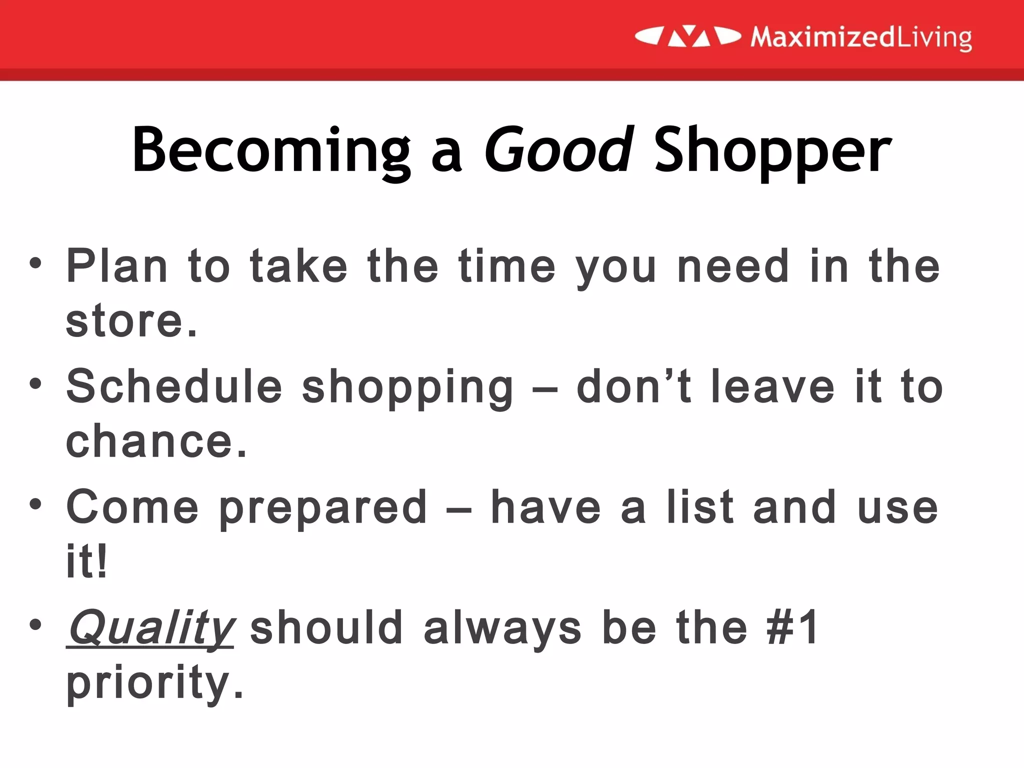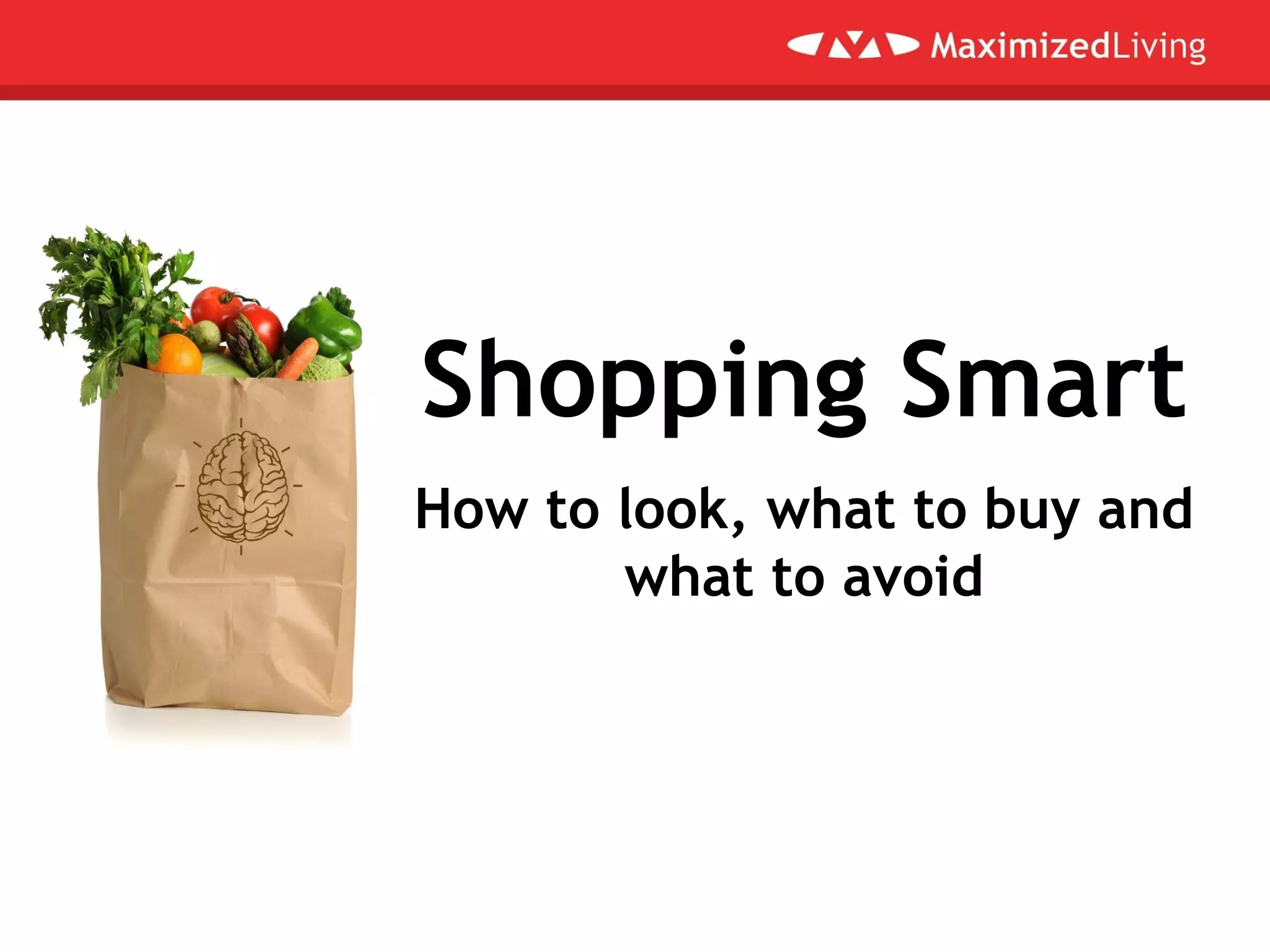 The document provides tips for smart shopping by becoming a prepared shopper, reading labels carefully, and being wary of questionable marketing claims. It recommends choosing foods with minimal natural ingredients, and avoiding items with MSG, artificial sweeteners, hydrogenated oils and chemical names. Common highly processed and toxic foods to limit are salad dressings, candy, deli meats, white bread, conventionally grown produce, margarine, diet drinks, GMOs, conventional dairy and packaged foods with flavor packets. The document emphasizes choosing high-quality whole foods like fruits and vegetables to avoid toxic ingredients and additives.