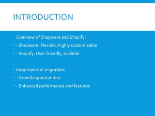 The document is a comprehensive guide for migrating from Shopware to Shopify, detailing the benefits of Shopify, pre-migration considerations, and the migration process. It covers choosing the right tools, data migration steps, testing, and post-migration tasks to ensure a smooth transition. Additionally, it provides insights into maintaining SEO and customer communication throughout the process.