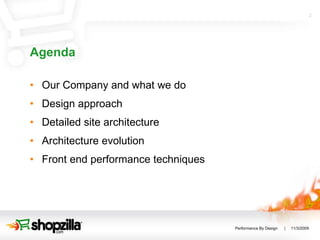 Shopzilla redesigned their architecture to improve performance and scalability. The new design simplified layers, utilized caching extensively, and applied best practices for front-end performance. This led to significant business benefits including a 7-12% increase in conversion rates, 8-120% increase in search engine sessions, and a 225% increase in development velocity. Performance testing was a key part of the new approach.