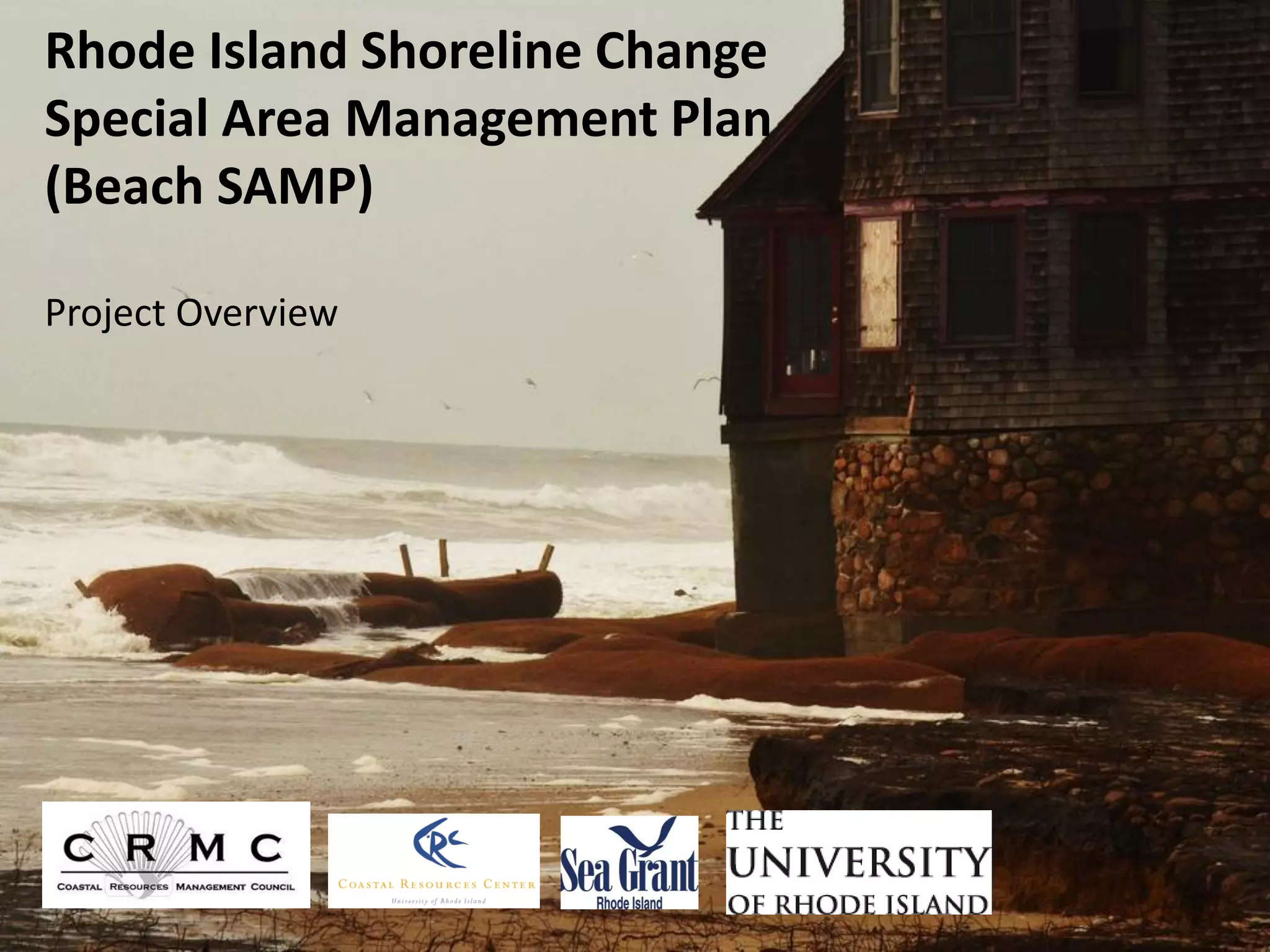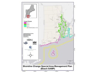 The Rhode Island Shoreline Change Special Area Management Plan (Beach SAMP) aims to create policies for managing coastline development amidst erosion and flooding risks. Key objectives include public involvement, transparency, and using scientific data to inform decision-making, supported by stakeholder engagement and education initiatives. The project will encompass research collection, policy development, and an outreach campaign to improve understanding and foster adaptive management practices.
