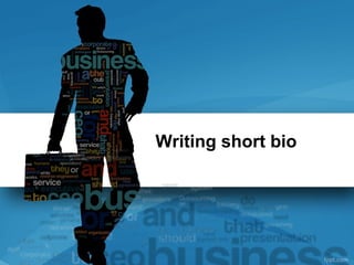 This document provides guidance on writing a short bio, including what to include, tips, and an example. A short bio should briefly introduce yourself and highlight your achievements and relevant projects in 2-3 sentences. It is important to include your current job, publications, professional memberships, awards, education background, work experience, and notable achievements. The bio should be interesting and relevant to your intended audience. It is closed with a reminder of who you are and contact details. An example bio is given that follows these guidelines in 3 sentences and less than 100 words.