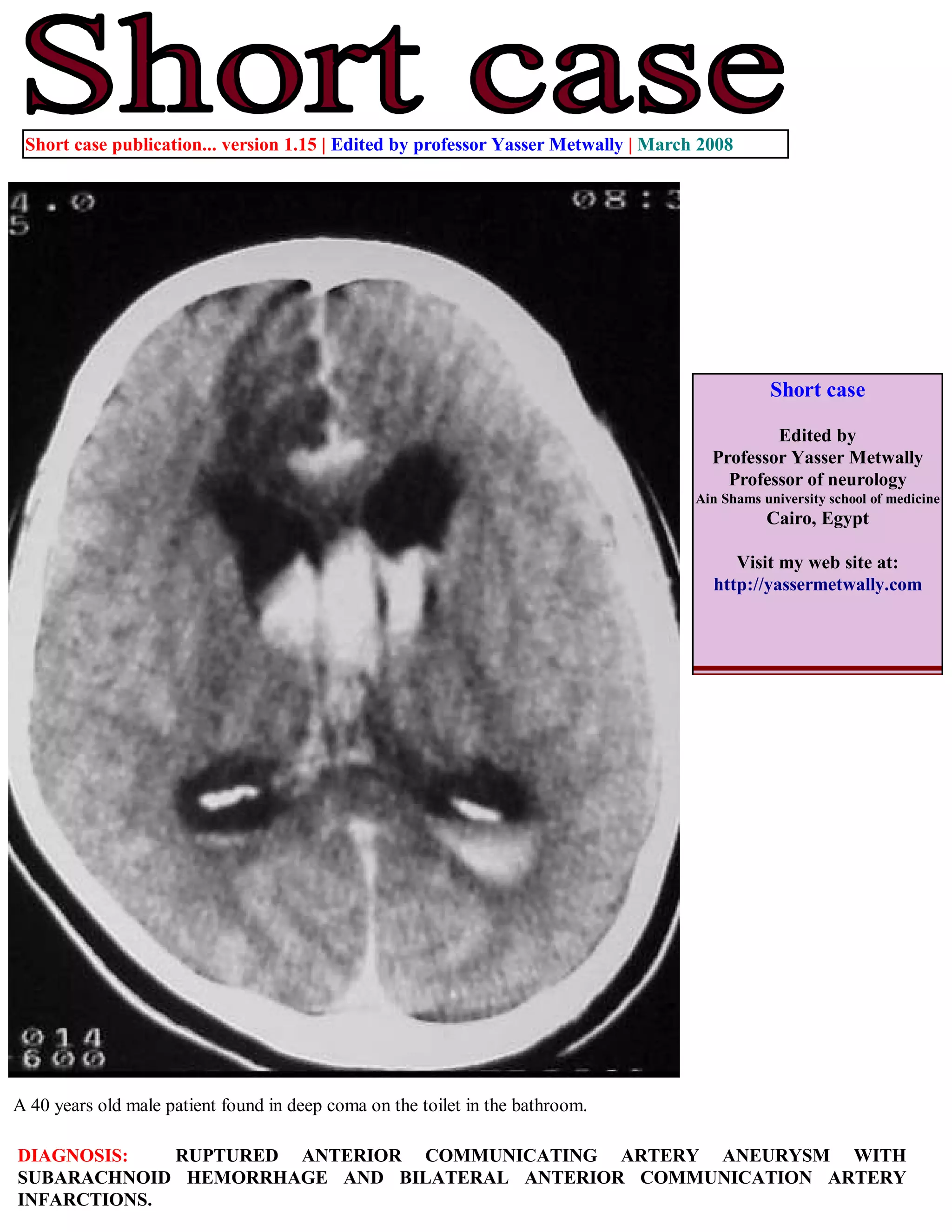 A 40-year-old male patient was found unconscious on a toilet with a ruptured anterior communicating artery aneurysm and subarachnoid hemorrhage. CT scans showed interfrontal subarachnoid hemorrhage breaking into the ventricles with blood in the occipital horns and bilateral anterior cerebral artery infarctions, more severe on the right side. The document describes images of the ruptured anterior communicating artery aneurysm and associated hemorrhaging and edema. It also provides information on accessing updated case publications on the author's website.