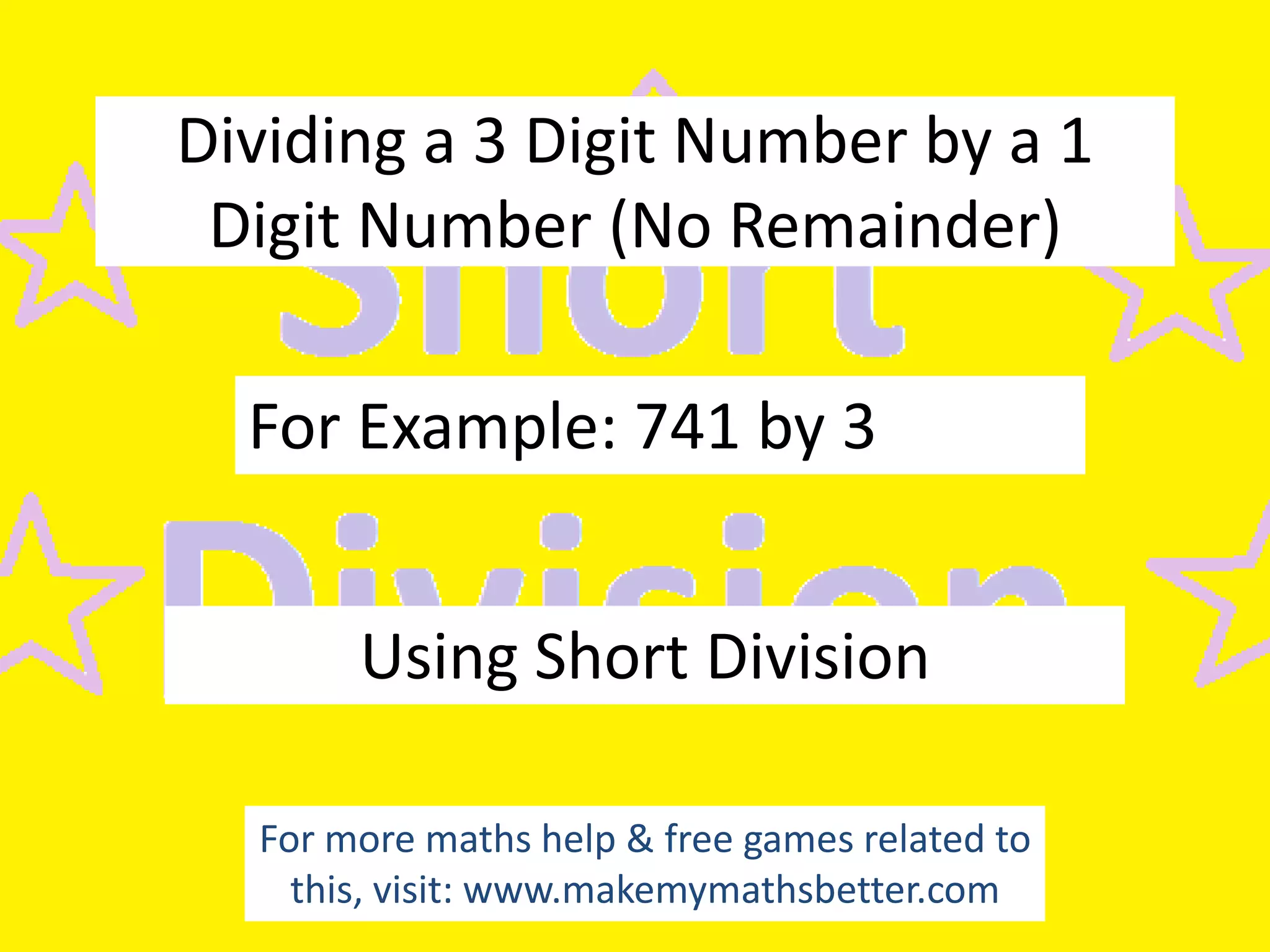The document provides step-by-step instructions for dividing a 3-digit number by a 1-digit number without remainder. It uses the example of dividing 741 by 3. The instructions are to place the larger number inside the division bar and the smaller number outside. Then divide the hundreds, tens, and ones columns sequentially, placing the quotients above and remainders beside the next column. Following these steps, the document arrives at the solution of 741 divided by 3 equals 247.